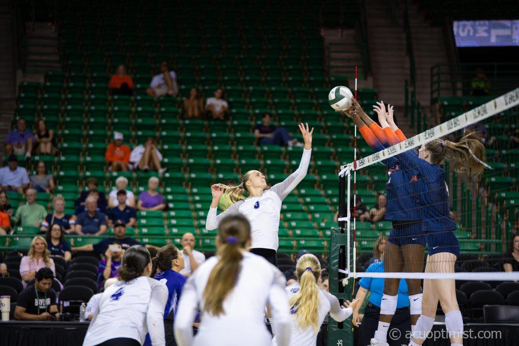 Courtney Church, redshirt sophomore outside hitter from Driftwood, tips the ball into the block. (Photo by Sam Gassaway)