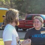 - Noah Henderson, sophomore marketing and management major from Denver, and senior Shay Bryant talk in line as they wait for food. (Photo by David Mitchell)