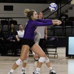 - Freshman libero Mackenzie Harris digs the opponent’s hit. (Photo by Megan Holley)