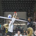 - Redshirt senior middle blocker Kennedy Shelstead competes with an Islander above the net. (Photo by David Mitchell)