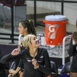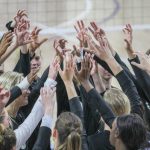 - Redshirt senior middle blocker Kennedy Shelstead rallies her teammates before the game. (Photo by David Mitchell)
