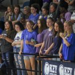 - Senior setter Makenzie Kesler pumps up the crowd after a score. (Photo by David Mitchell)
