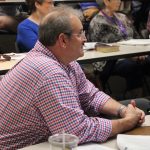 - Joel Childers listens carefully to Suzie Macaluso speak. (Photo by Riley Fisher)