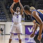 - Senior guard Trey Lenox shoots a three-pointer. (Photo by Adelin Blackmon)