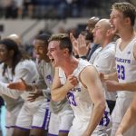 - Sophomore forward Joe Pleasant, senior guard Payten Ricks and sophomore forward Clay Gayman celebrate an exciting play. (Photo by David Mitchell)