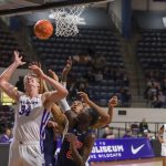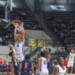 - Redshirt junior center Kolton Kohl dunks the ball over his opponents. (Photo by David Mitchell)