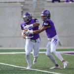 - Sophomore quarterback Sema’J Davis hands the ball off to senior runningback Tracy James. (Photo by David Mitchell)