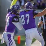 - Senior wide receiver Josh Fink and Junior tight end Branden Hohenstein celebrate a touchdown. (Photo by David Mitchell)