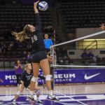 - Junior outside hitter Katelyn Mueller reaches for the ball. (Photo by Adelin Blackmon)