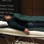 - A student relaxes in a compressed air massage machine. (Photo by Riley Fisher)