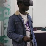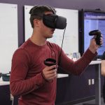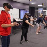 - Amos Gutierrez, learning technology specialist and Adobe ambassador, tries to beat students’ scores in Beat Saber. (Photo by Riley Fisher)