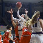 - Junior forward Alyssa Adams jumps for a layup. (Photo by David Mitchell)