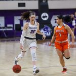 - Senior guard Pamela Herrera dribbles down the court. (Photo by David Mitchell)