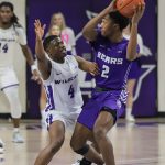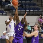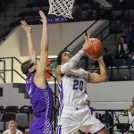 - Sophomore guard Damien Daniels blocks Central Arkansas’ freshman guard Lewis McDaniel’s shot attempt. (Photo by Riley Fisher)