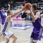 - Sophomore forward Clay Gayman jumps around a falling teammate to block Central Arkansas’ junior guard Rylan Bergersen’s shot. (Photo by Riley Fisher)