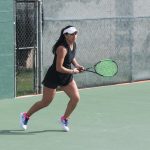 - Ileana Mocciola, junior management major from General Roca, Rio Negro, Argentina, watches as her opponent serves. (Photo by Meghan Long)