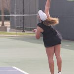 - Sarah Adams, senior english major from San Antonio, serves the ball. (Photo by Meghan Long)