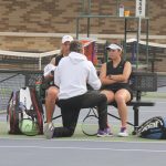 - John Walker, director of tennis, speaks with the players between matches. (Photo by Meghan Long)