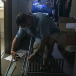 - A parent of a freshman builds shelving in Sikes Hall. (Photo by Riley Fisher)