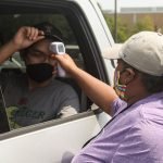 - A Sikes Hall resident assistant takes temperatures before students and families exit their cars. (Photo by Riley Fisher)