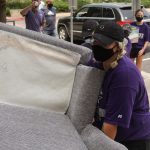 - Lauren Little, junior communications major from San Antonio, moves a couch into Gardner Hall. (Photo by Riley Fisher)