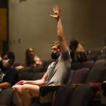 - Audience members participate in a hypnosis exercise. (Photo by David Mitchell)