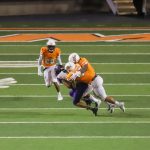 - Senior linebacker Hunter Kier pushes UTEP’s senior runningback Joshua Fields away from the end zone. (Photo by Riley Fisher)