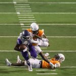 - Redshirt junior defensive back Broderick Harrell watches as his teammates tackle two Wildcats. (Photo by Riley Fisher)