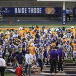 - Kade Parmelly, senior offensive lineman, greets his teammates as they walk onto the field. (Photo by Riley Fisher)