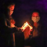 - Two students light each other’s candles at the candlelight devotional Thursday. (Photo by David Mitchell)