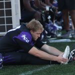 - Sophomore placekicker Blair Zepeda stretches on the sidelines. (Photo by Ryland Mallett)