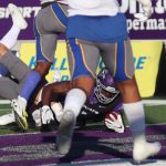 - A group of Wildcats bring down junior quarterback Zach Bronkhorst. (Photo by David Mitchell)