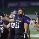 - Wildcats celebrate a fumble recovery by senior linebacker Jack Gibbens. (Photo by David Mitchell)