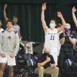 - Players on the Wildcats’ bench celebrate a basket. (Photo by David Mitchell)