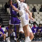 - Junior guard Clay Gayman leaps to block a jump shot. (Photo by David Mitchell)