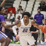 - Redshirt sophomore guard Immanuel Allen looks for a teammate to pass to as he enters the paint. (Photo by David Mitchell)