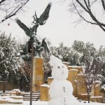 - A student takes a picture of a large, melancholy snowman sitting in the middle of the frozen GATA Fountain. (Photo by David Mitchell)