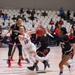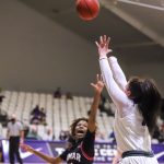 - Lamar senior guard Jadyn Pimentel jumps in front of ACU junior guard Paige Emborsky. (Photo by David Mitchell)