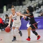 - Redshirt sophomore guard Kamryn Mraz catches the basketball in midair. (Photo by David Mitchell)