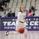 - Redshirt sophomore guard Kamryn Mraz races down the court. (Photo by David Mitchell)