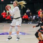 - Junior guard Paige Emborsky attempts a three-pointer. (Photo by David Mitchell)