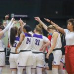 - Players huddle up after their 71-65 loss against the Lamar Cardinals. (Photo by David Mitchell)