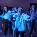 - Students dance to “Footloose” during halftime in front of the screen at the watch party. (Photo by Riley Fisher)