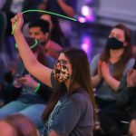 - Junior communication major Eastin Kandt twirls her glow stick in the air during a media timeout. (Photo by Riley Fisher)