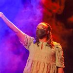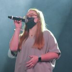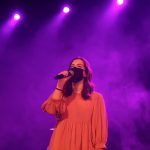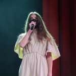 - Aubrey Cobern, senior art major from Austin, sings a solo in the closing number of the show.(Photo by Meghan Long)