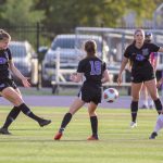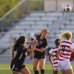 - Sophomore forward Caylen Wright heads the ball toward a teammate. (Photo by David Mitchell)