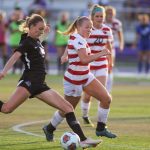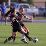 - ACU sophomore midfielder K’lynne Massey and UIW freshman defender Bailey Mover chase after the ball. (Photo by David Mitchell)