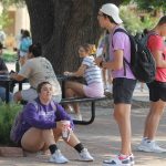 - (Photo by Sydney Varner) Students talk between classes near the GATA fountain on campus.