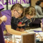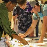 - Students gather around a table to paint the Study Abroad map.(Photo by Telvee Marvie)