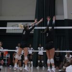 - Junior middle blocker Breanna Box and junior outside hitter Jada Birkel reach above the net to block the ball. (Photo by Shelly Womack)